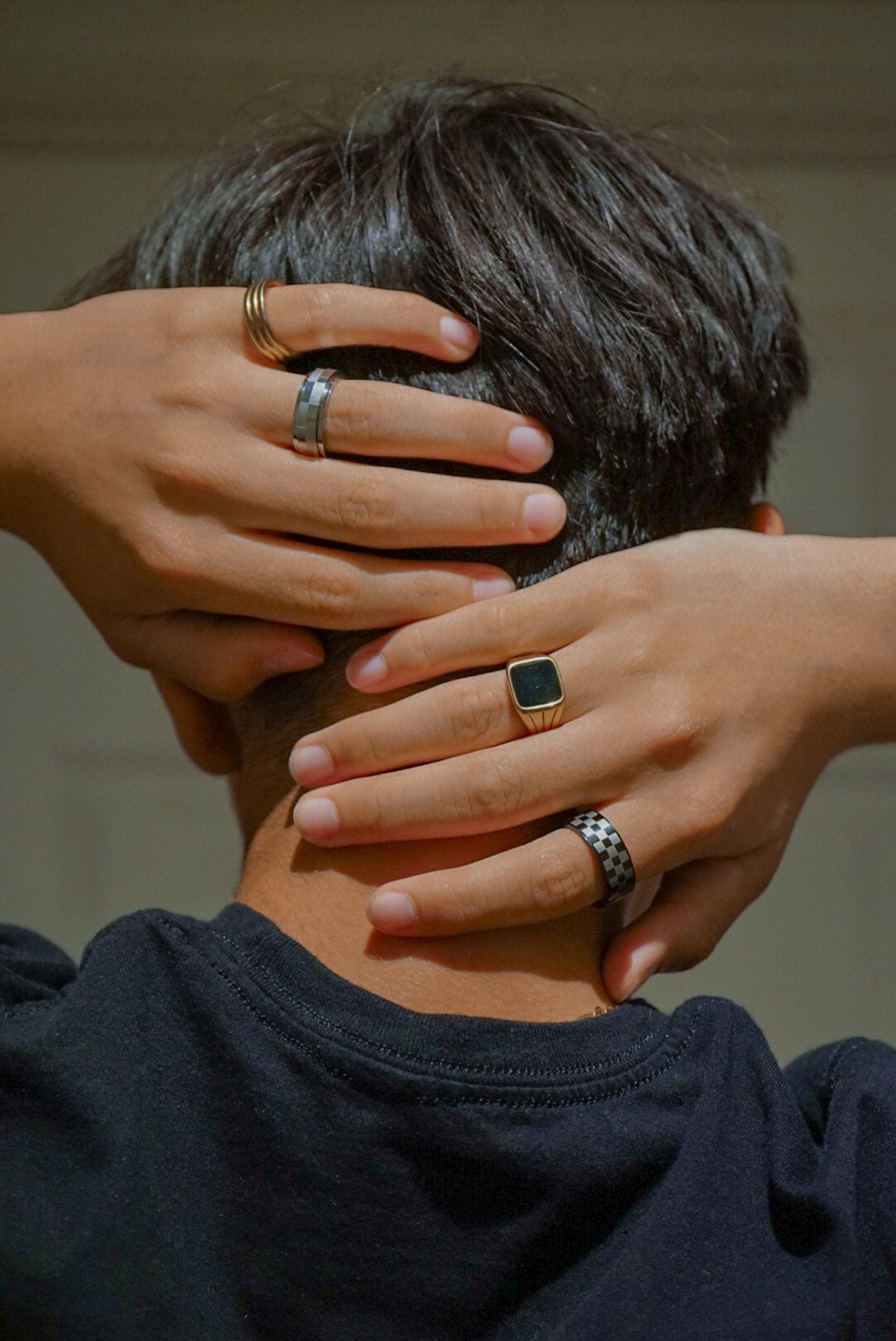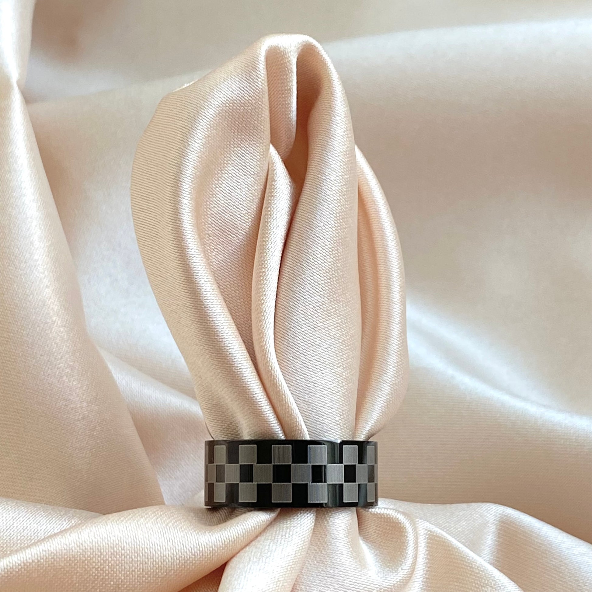 - Colors: Black ring with silver checkerboard pattern going around the whole band.