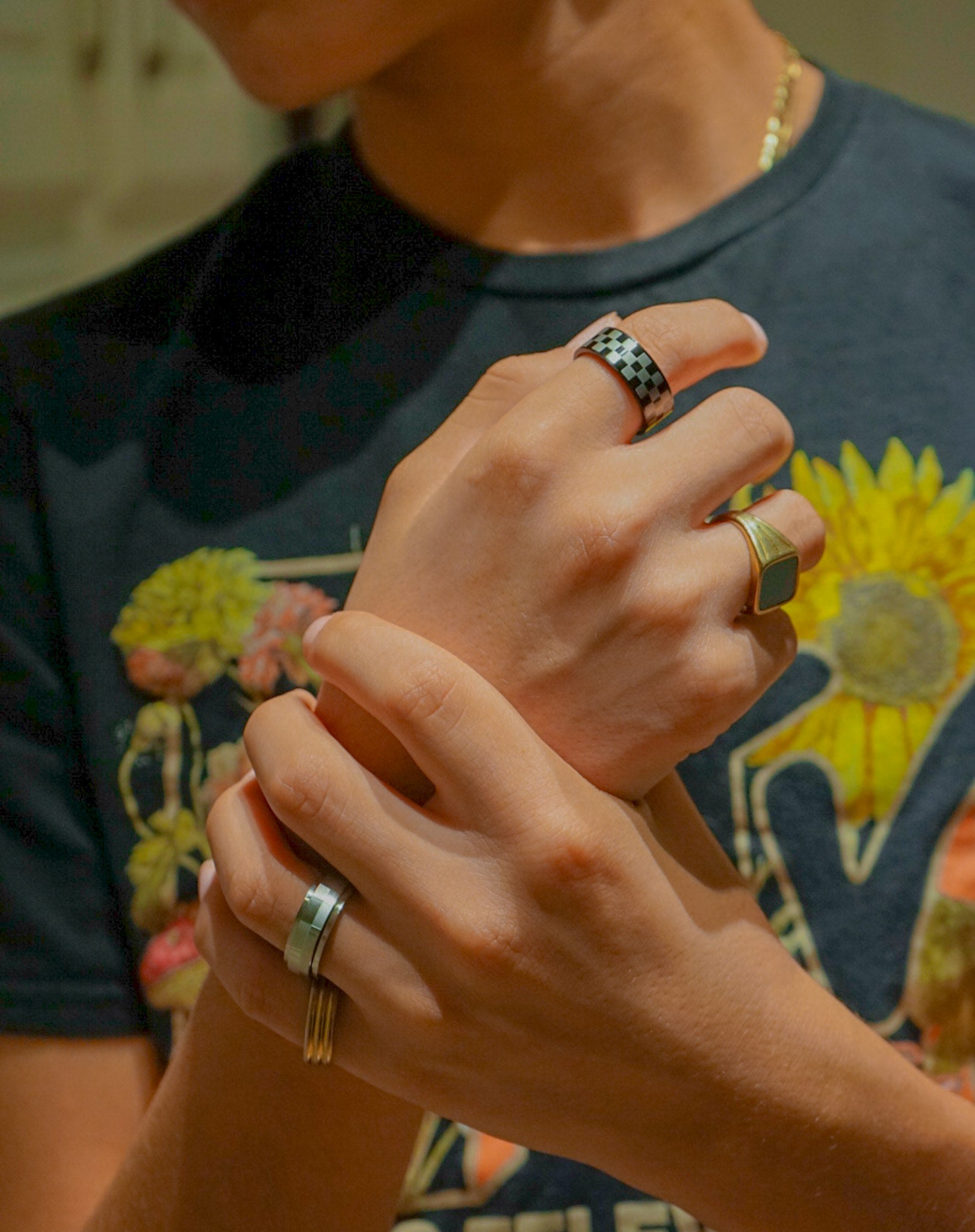 - Silver ring with silver frosted checkerboard pattern going around the band.
